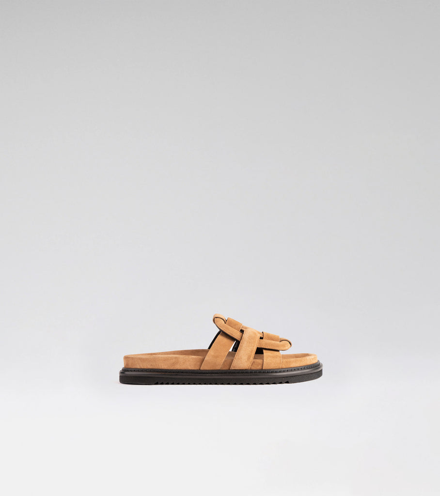 MOROBÉ'S Bernie signature slides with hallmark upper, giving it it's recognizable look. The bio sole gives everyday comfort and gives your looks a more contemporary feel. This pair is crafted from 100% light cognac crosta leather.